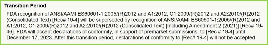依據美國FDA 已經承認並公告的共識標準資料庫(Medical Device Databases & Recognized Consensus Standards)ES 60601-1 Ed 3.2(對應IEC 60601-1:2005+A1:2012+A2:2020)的轉換期為2023年12月17日,詳細說明如下: